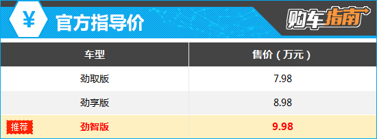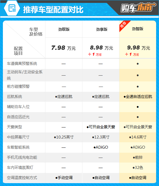 通过对比配置不难发现,劲享版相比入门的劲取版,虽然增加了多项日常使用率较高的配置,如可开启全景天窗、ADiGO车载智能系统以及自动空调等,但与时下主流还是存在差距。反观推荐车型,增加了诸多实用性配置以及主动安全和辅助驾驶功能,智能化进阶,能够直观改善日常用车体验,建议升级。